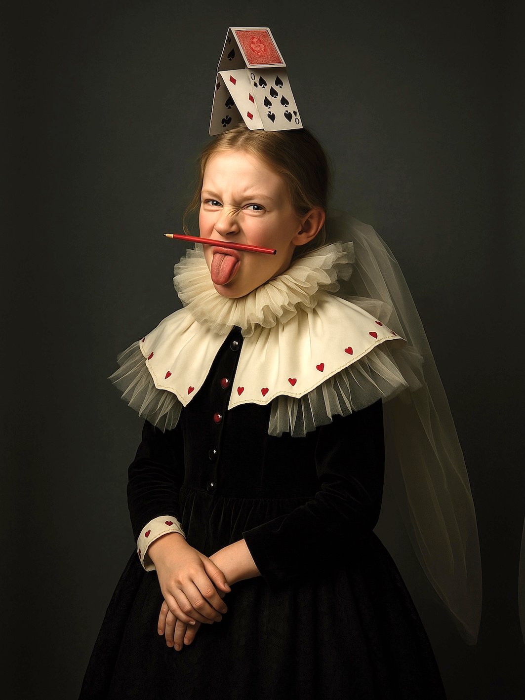 Lo Sbeffeggio Ludopatico – Un’irriverenza necessaria Ciclo ICONOCLASTICA di Luciano Di Gregorio Nel panorama dell’arte contemporanea, l’opera “Lo Sbeffeggio Ludopatico” di Luciano Di Gregorio, appartenente al ciclo ICONOCLASTICA, si impone come un cortocircuito visivo e concettuale, capace di fondere ironia e critica sociale in un’unica, sorprendente immagine. Il fotografo costruisce un ritratto che richiama la pittura fiamminga e barocca, per impostazione luministica e per la rigidità teatrale della posa. Tuttavia, la compostezza viene subito incrinata da elementi di dissonanza: la bambina mostra la lingua con un ghigno beffardo, tiene un pastello tra i denti come fosse un’arma giocosa, e soprattutto indossa un collare elisabettiano decorato da piccoli cuori, segni di una giocosa decadenza. Sul capo, a completare l’atto iconoclasta, un fragile castello di carte: simbolo del vizio, della precarietà, e della compulsione ludica. Di Gregorio gioca volutamente con la tensione tra codici alti e bassi, tra il rigore delle convenzioni estetiche e la carica dissacrante del gesto infantile. L’immagine diventa così un’allegoria della ludopatia: un gioco che non è più innocente, che trasforma il divertimento in ossessione, e che qui viene ridicolizzato, privato della sua aura tragica attraverso lo sberleffo. Il titolo stesso, Lo Sbeffeggio Ludopatico, è un ossimoro concettuale: la malattia sociale del gioco d’azzardo, una delle nuove schiavitù del nostro tempo, viene affrontata con leggerezza, come se un bambino la irridesse con la lingua di fuori. È proprio in questo scarto che risiede la forza dell’opera: la critica non passa per il moralismo, ma per la risata, per la parodia che disarma. L’artista, con il ciclo ICONOCLASTICA, sembra proporre una riflessione più ampia sul ruolo dell’immagine oggi: icona e idolo da distruggere, smontare, desacralizzare. Come un’eco lontana di Dada e Surrealismo, ma attualizzata nella fotografia concettuale, Di Gregorio ridisegna i confini tra sacro e profano, tra arte alta e cultura pop, tra dramma e gioco. In definitiva, “Lo Sbeffeggio Ludopatico” non è solo un ritratto ironico: è un atto politico, un invito a guardare in faccia le contraddizioni del presente senza paura di riderne. Perché, come l’artista sembra suggerire, anche la risata può essere un’arma iconoclastica.